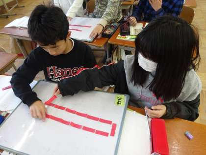 18本の棒を使って,色々な長方形を作り,たてと横の長さがどのように変わるかを調べました。