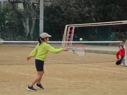 部活動ソフトテニス部の支部交流会があり,柊野小学校と練習試合を行われています。,「頑張れ!」「ナイス!」の声がたくさん聞こえています。