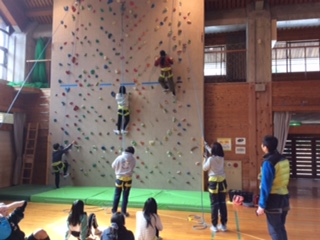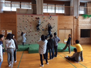 プレイホールではボルダリングとクライミングに挑戦です。ロープをつけて高い方がクライミングです。赤色だけを使って登るなどレベルの高い登り方に挑戦している子もいました。