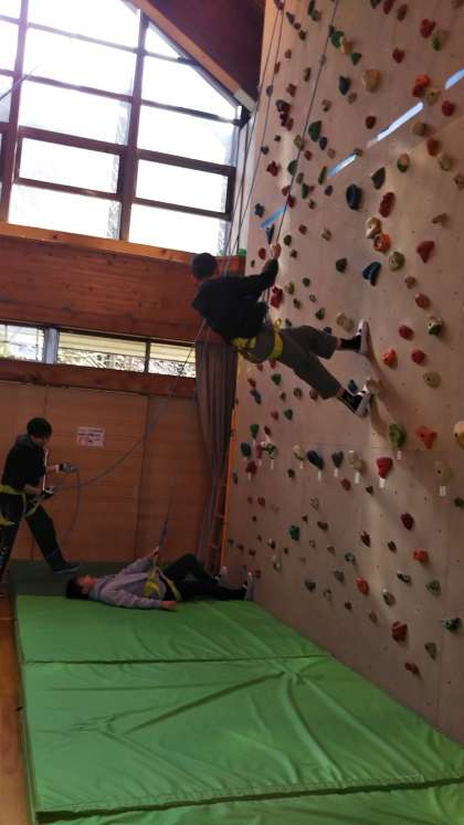 壁を登ります。担任が一生懸命それをサポートしています。