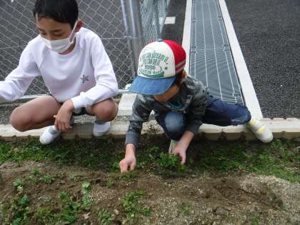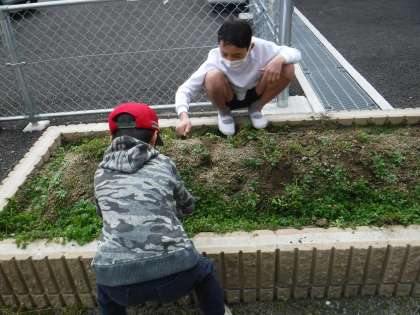 6年生が卒業遠足で「花背山の家」に出発しました!その間に畑の草を抜いて次にじゃがいもを植える準備をしました。2年生と5年生でがんばりました!