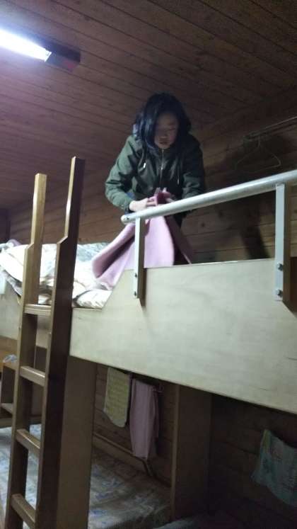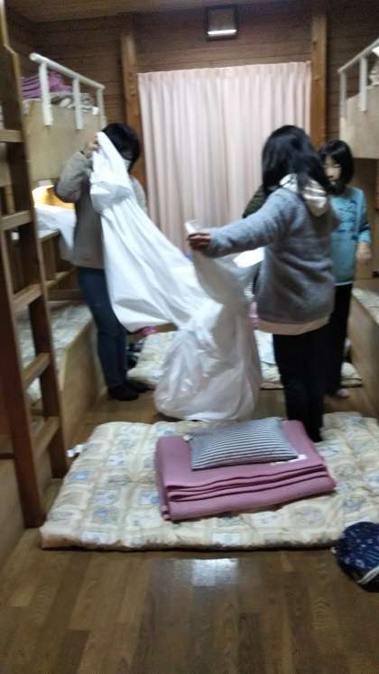 シーツなどの寝具の片付け方は、決まっています。正確に!友達と協力して!