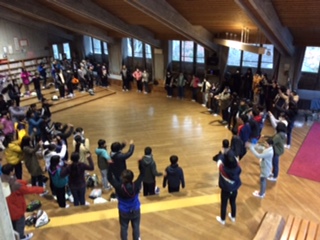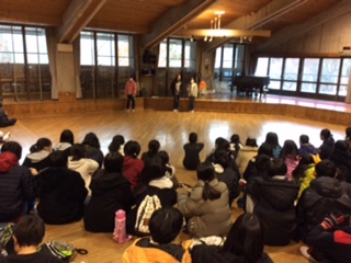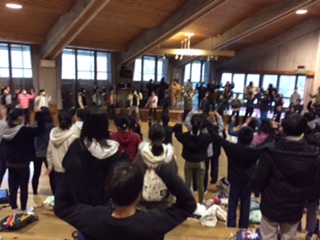 二日目の朝、やっぱり外は少し寒いです。館内は暖房が入っているので大丈夫です。朝の集いでは、ラジオ体操をしました。体を動かしてさあ、朝ごはんです。