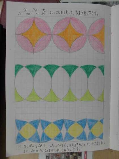 今日は,3年生で学習したコンパスを使って,もようづくりをしました。