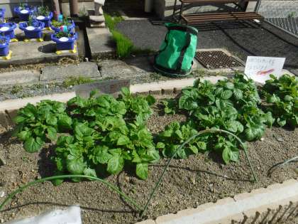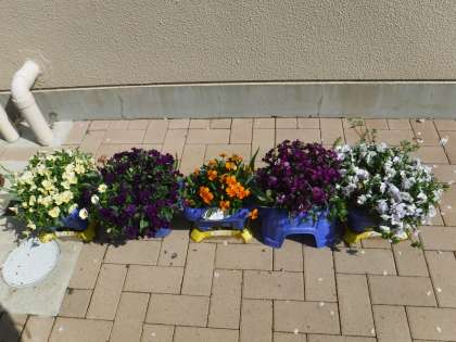 卒業・入学の前に寄せ植えをした、ビオラは大きくなりキレイに咲いています。そらいろ畑に植えたジャガイモも元気に大きく育っています!夏の収穫が楽しみですね!