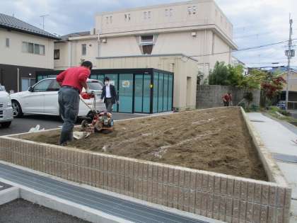 学校の畑を耕し,サツマイモの苗を植えやすいように畑を作ってくださっています。