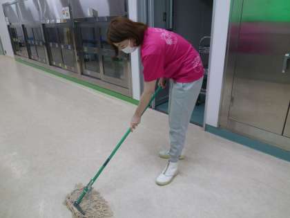 調理員さんがサービスホールの床の汚れを磨いてくれていました。