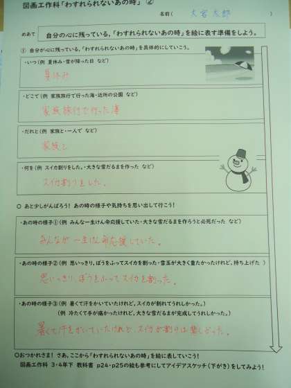 図画工作科「わすれられないあの時」2について,ポイントをお知らせします。ワークシートには,自分が心に残っている「わすれられないあの時」を具体的にしていく手立てが書かれています。「いつ」「どこで」「だれと」「何を」など考えていきます。そして「あの時の様子」まわりの様子や気もちなどを思い出します。思い出の写真を見るなどして「わすれられないあの時」考えてみるのも一つの方法です。