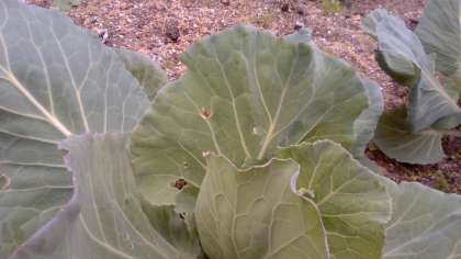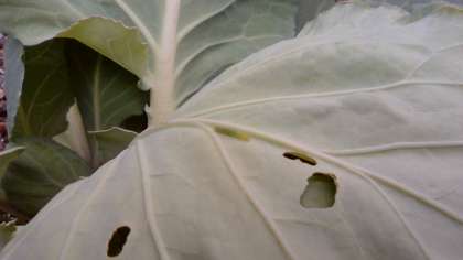 3年生の花壇で育てているキャベツに水をやっていると,虫食いあなを発見!