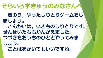 今回は,生き物しりとりです。また,チャレンジしてみてね。