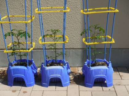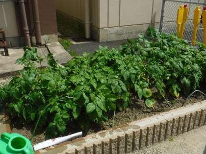 2年生のミニトマトも元気ですよ!2年のO先生に米ぬかをもらったので肥料として入れました。じゃがいもももう少しで収穫かな。