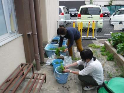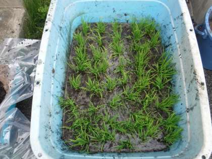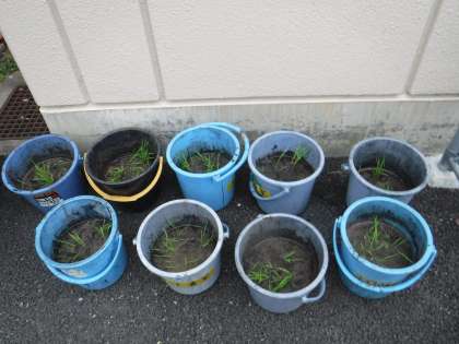 地域の方に頂いた「米の苗」を1年生が植えた後,お米大好き「田植え女子」で植えました。バケツ田んぼやたらい田んぼが並びました。立派な苗で,おいしいお米ができるのが楽しみです。