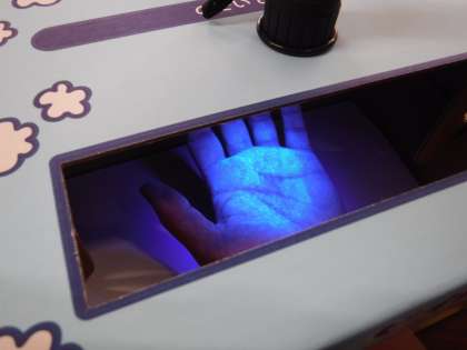 今日は、そらいろ担任と養護教諭とで感染予防のために正しい手洗いの仕方を研修しました。最初に「手洗チエッカーローションを小豆つぶほどの量を両手の手のひら,手の甲・指の間などまんべんなくつけてブラックライトで確認しました。
