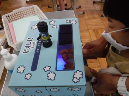 手洗いキッドを使って,しっかりと汚れが落とせているのか確認しました。その後に,洗い残しやすいポイントを学習しました。