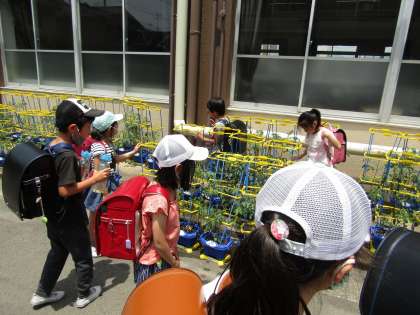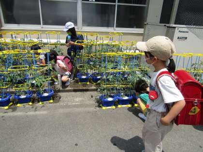 トマトの水やりに行きました。今日来ていないグループのお友達の分まで,水やりを頑張りました。