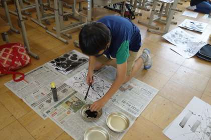 図画工作で『墨と水から広がる世界』の学習をしました。習字で使う墨を薄めたり,画用紙を濡らして墨をにじませたり,道具を使っておもしろい模様を描いたりしました。学校で用意した道具以外にも,いろいろ試しながら不思議な模様を見つけていました。使える道具は2つまで,模様を描くのは3回までという条件の中で,偶然できる模様を楽しみました。次回は,描いた模様から何を連想できるかを考えていきます。