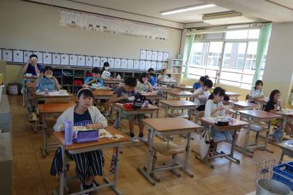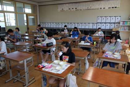給食時間は全員前を向いて,クラシックを聴きながら食べています。少し寂しいですが,「一緒に食べられる」ことだけでもうれしく思います。
