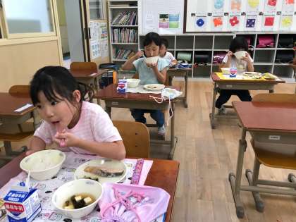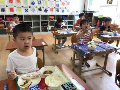 昨日と今日で,初めての給食だった子どもたちですが,とてもおいしかったようでもぐもぐとはしを止めずに食べていました!