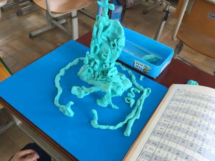 「おうちを作ったよ!えんとつがi(い)で〜…。」
