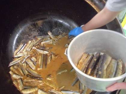 給食室では,さんまの身が崩れないよう丁寧に煮て,