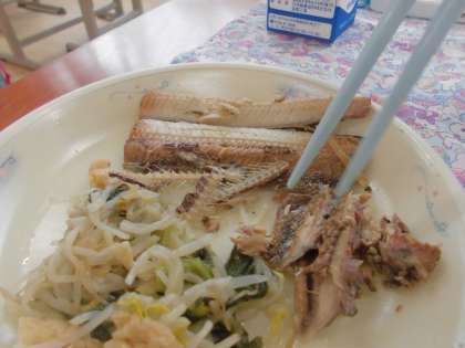 1年生の教室をのぞいてみると,一生懸命骨を外して食べていました。