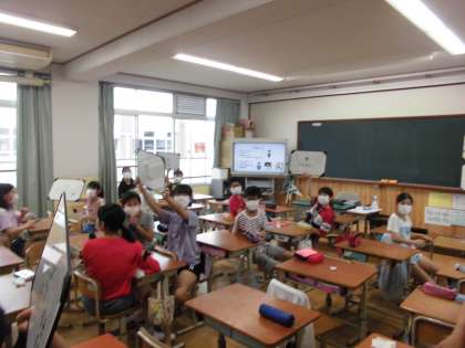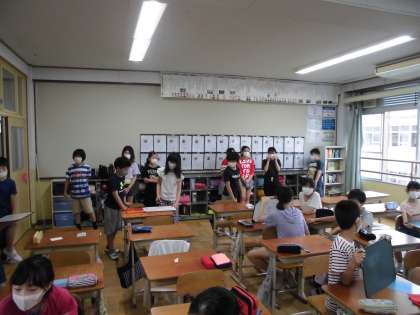 新しい班のメンバーとの仲を深めるために,班対抗でお絵かき対決をしました。代表者が7秒でお題の絵をかき,何をかいたか当ててもらうというゲームです。