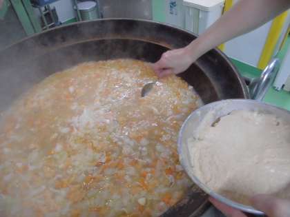 給食室では,トマトだご汁のだんごを手作りしていました。