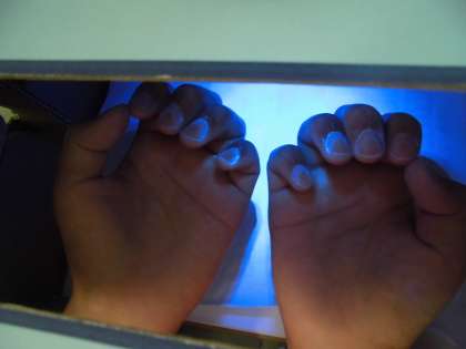 青白く光っているところが洗い残しです。