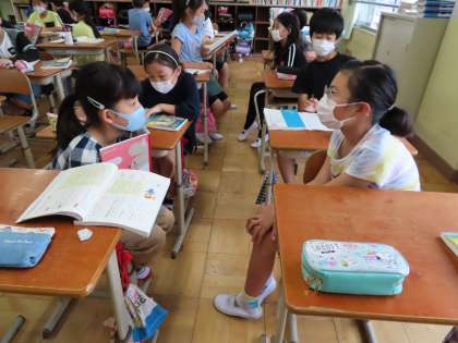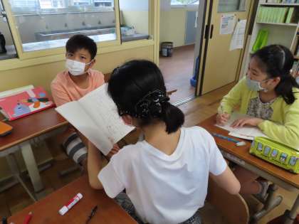 国語科「きいて,きいて,きいてみよう」の学習で,「きき手」「話し手」「記録者」に分かれてインタビューをしました。