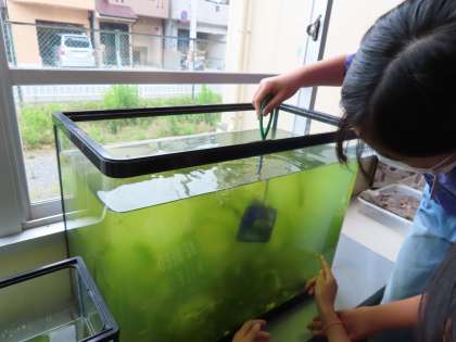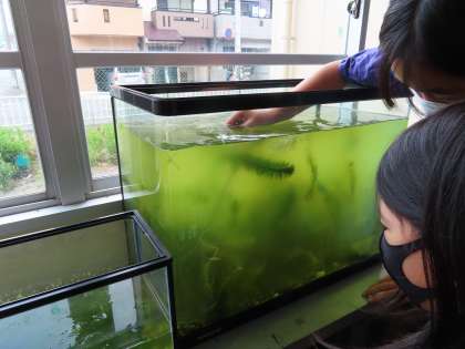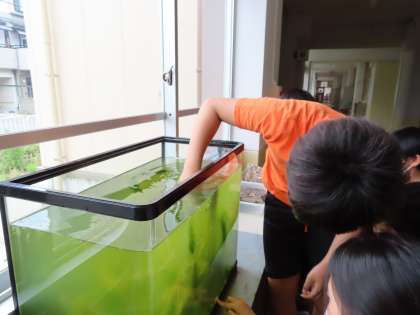 水槽から,メダカのオスとメスを探して,教室用水槽にうつします。
