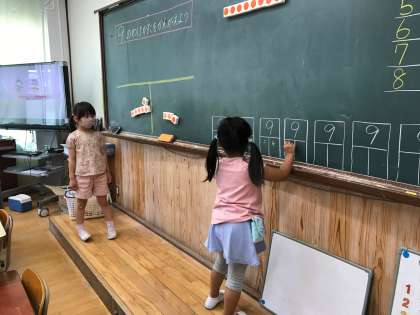 子どもたちは,数図ブロックを使った分け方にだいぶ慣れてきたようだったので,今日は「9のわけかた」をブロックを動かして分けてみる子とそれをみて答えを書く子とレベルアップしてみました☆
