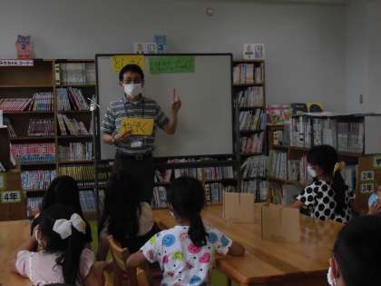 子どもたちは,クイズを交えてもらいながら,本の正しい扱い方,図書館では静かにすることや本を大切にすることを学んでいました☆