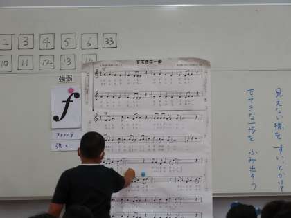 音楽の学習では,音の重なりを感じ取りながら曲を聞いています。強弱記号に注目しながら,曲の調子を感じていました♪