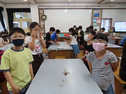 この日の理科は,実験用安全ゴーグルをつけての学習でした。