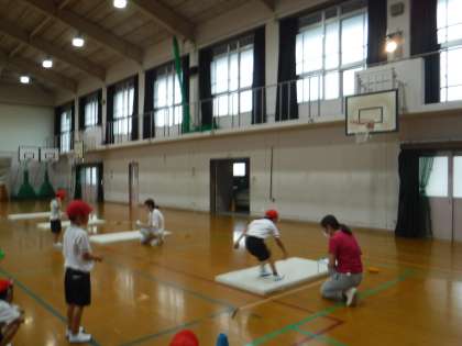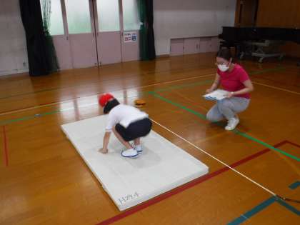 今日は,1年生のスポーツテスト「立ちはばとび」をしました。「せーので!」と跳んではかりました。1年1組のI先生にはかってもらいました。
