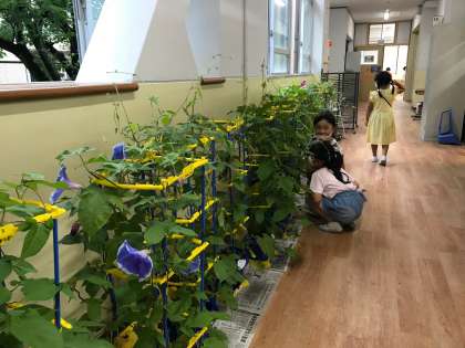 子どもたちは,アサガオを自分たちの教室の前の廊下に避難させました。