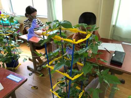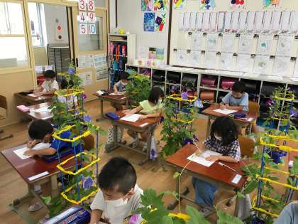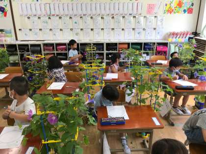 子どもたちは,アサガオのにおいをかいだり,色を見たり,中のほうまでしっかりみたりとじっくり観察をしていました☆