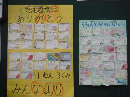 さっそく,1年生からお礼の手紙が届きました。「クイズがおもしろかった。って書いてある!」と嬉しそうに読んでいました。1年生もそらいろのみんなも同じ大宮小学校の子どもです。これからもなかよくしましょう!