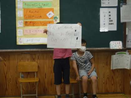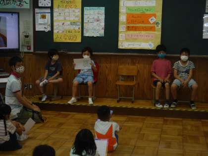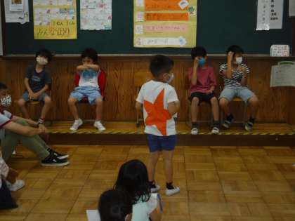 1年生となかよくなろう!の会,最終日は4組です。お互いに自己紹介をしてその後そらいろのことをよく知ってもらうためにクイズもしました。「そらいろの2年生は5人である。〇か✖か?」「〇だと思う人?」「✖だと思う人?」と楽しいクイズをして盛り上がりました。