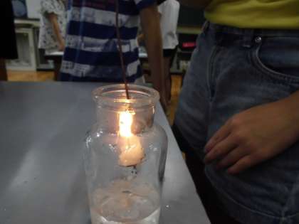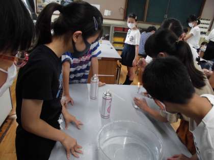 酸素・窒素・二酸化炭素の中に火を入れてどうなるか調べます。