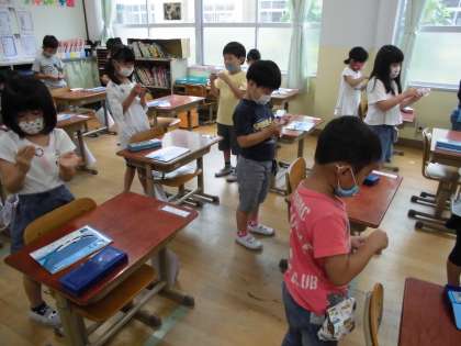 算数の授業の始めには,計算カードを読んでいます。