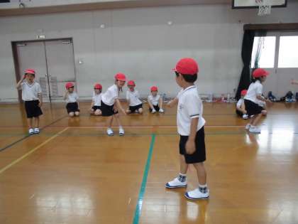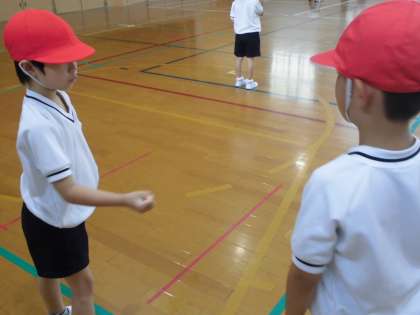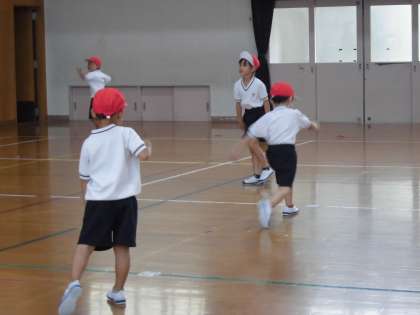 今日は,じゃんけんをしてグーで勝ったら「グ・リ・コ」,パーで勝ったら「パ・イ・ナ・ッ・プ・ル」など大きな一歩で進んでいきました。
