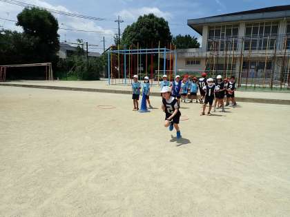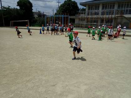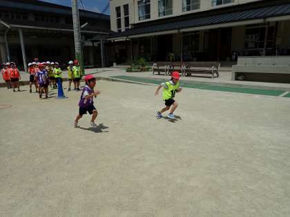 代わりにフラフープの枠に入ったら次の走者が走り出すリレーでした。