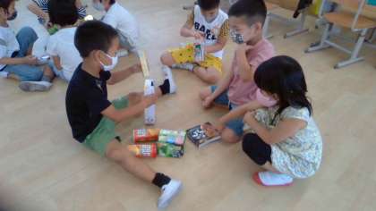 友達と話しながら,積みやすい形などに気付いている子もいました。