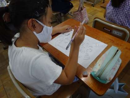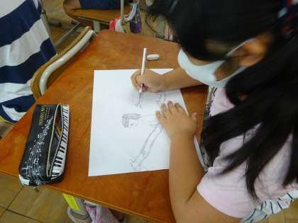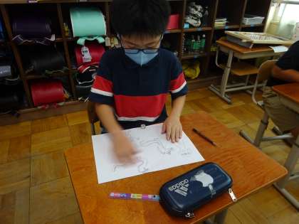 「先生,しゅくだいわすれました」というお話から,宿題を忘れた理由を絵にしています。自分だったらこんな嘘をつく!と想像しながら楽しそうに描いていました。どんな絵が完成するか楽しみです!