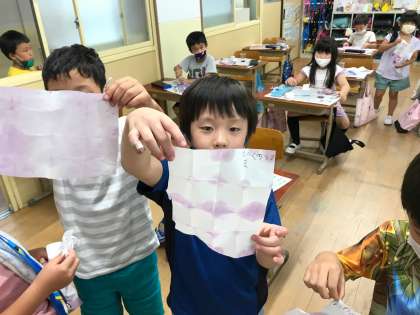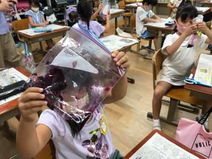 しぼるとどんどん色が出てきて,子どもたちは「うわぁ〜ぐじゅぐじゅしてる。」「なんかジュースみたい!」と思ったことを言いながらカップに移しました。