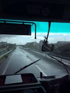 2回目のトイレ休憩を終え、ビーチランドに向かっています。所々、雨や風がきつく、速度制限もあって予定より遅れています。でも、進行方向が明るくなって来ました。到着する頃には雨も止んでいるかも。