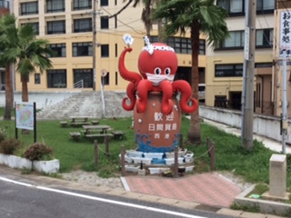 師崎港から約10分。日間賀島に到着です。雨があがっています。近くの浜で写真を撮りました。ホテルまでは迎えのバスに乗ります。