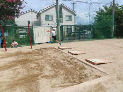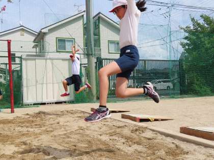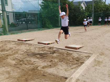 助走や踏切,空中動作など,より遠くへ跳ぶための工夫をして,自分の記録に挑戦しています。
