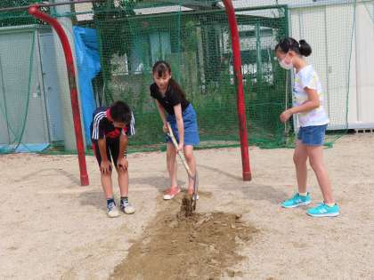 着地したときに足が痛くならないように…と,砂場の砂を柔らかくしてくれています。暑い中,ありがとうね♪